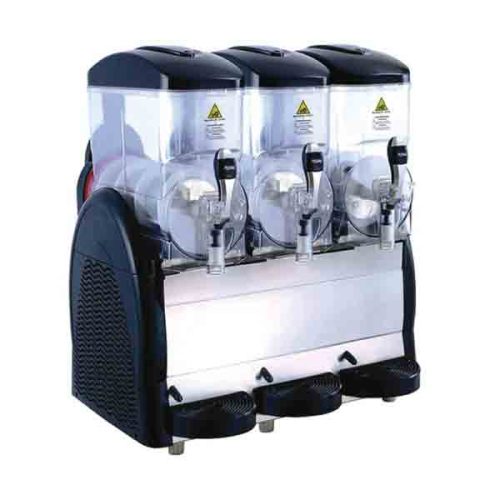 Enfriador de aguas frescas de tres tanques tipo fuente (spray), con gabinete y palancas fabricadas en acero inoxidable.