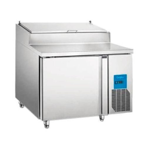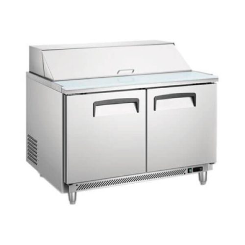 Mesa refrigerada de 13.7 pies cúbicos para colocar debajo de mostradores, con superficie plana. Incluye 2 parrillas y sistema de refrigeración R-290. Rango de temperatura 1°C a 4°C. 115 V/60 Hz. Medidas (frente, fondo, alto): 121 x 77 x 88 cm.