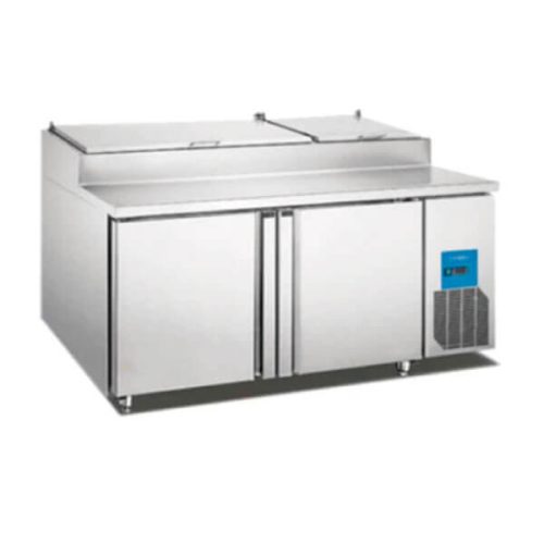 Mesa de preparación de sándwiches y ensaladas de 7 pies cúbicos. Incluye 8 insertos para organizar ingredientes 1 parrilla y sistema de refrigeración R-290. Rango de temperatura 1°C a 4°C. 115 V/60 Hz. Medidas (frente, fondo, alto): 68 x 77 x 103 cm.